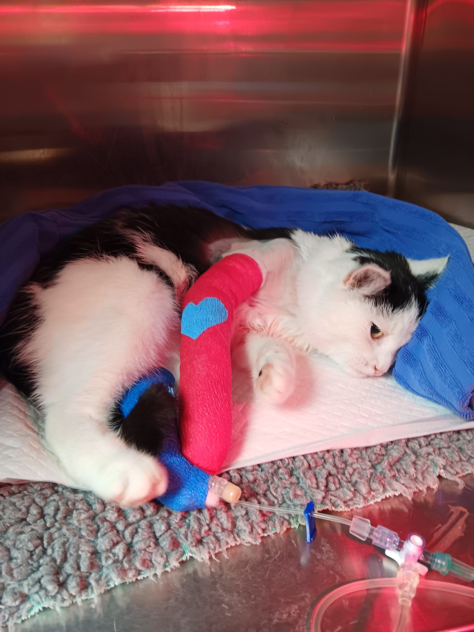 Die heimatlose Katzendame hat sich seit einiger Zeit auf einem Campingplatz aufgehalten. Feriengäste fütterten sie und Alma wurde dort geduldet. Eines Tages wurde Alma verletzt aufgefunden. Offenbar erlitt sie einen schweren Unfall. Glücklicherweise hat jemand sie in die Tierklinik Thun gebracht. Da Alma keinen Besitzer hat und niemand die Verantwortung für dieses Tier übernehmen will, stellte sich die Frage, wie nun mit dem armen Büsi vorgegangen werden sollte. Die Tierärztin machte als erstes eine Notfallbehandlung und meldete sich dann bei uns. Es zeigte sich, dass ein Vorderbein gebrochen war und eine Operation unumgänglich war. Die Kätzin war sonst in einem guten Allgemeinzustand und die Prognose für eine Heilung sah gut aus. Darum entschieden wir uns, Alma in unsere Obhut zu nehmen und nach ihrer Genesung ein neues Zuhause für sie zu suchen.